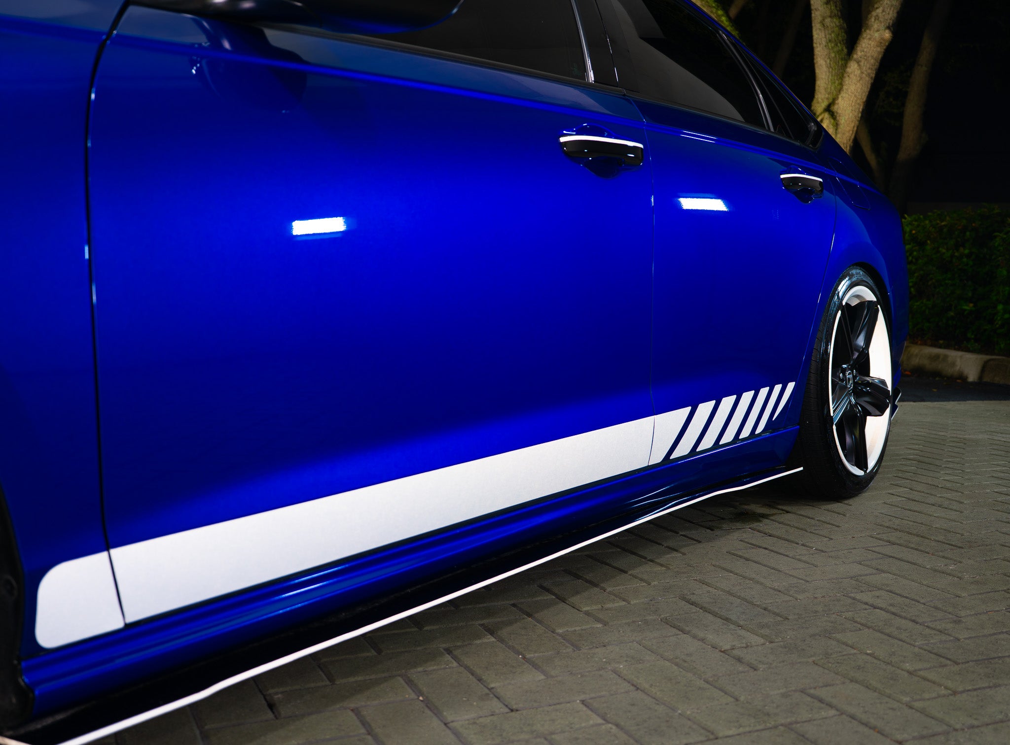 THIS SETUP COMES COMPLETE WITH DRIVER AND PASSENGER SIDE STRIPES IN GLOSS BLACK WITH OPTIONAL REFLECTIVE COLOR HIGHLIGHTS.
